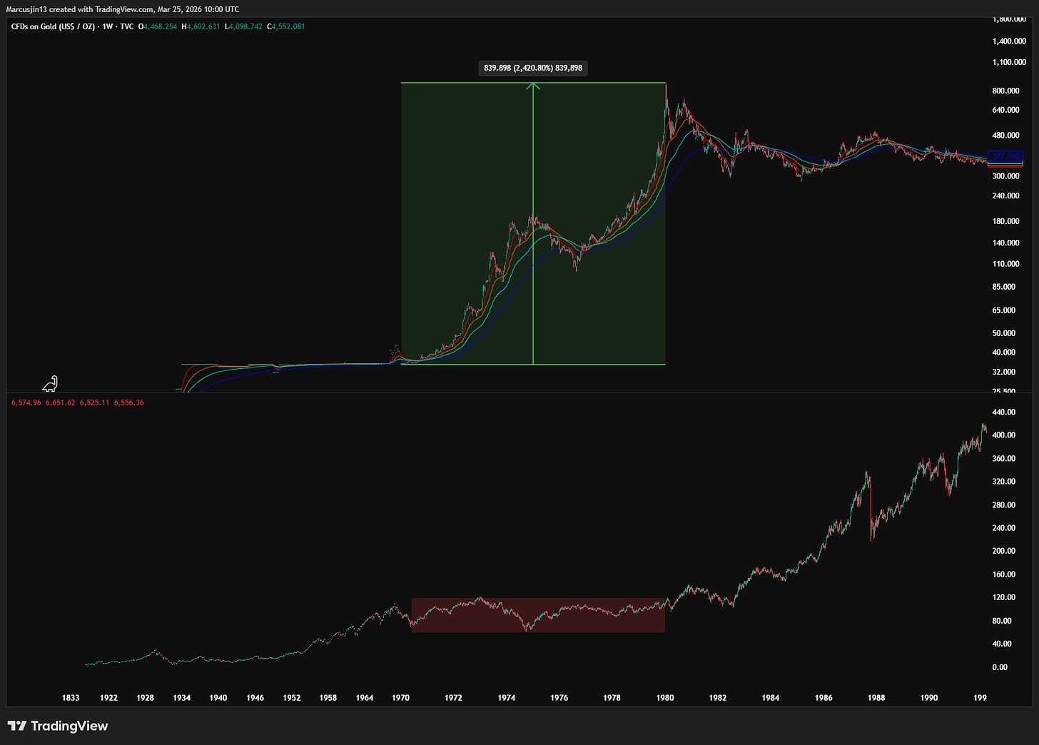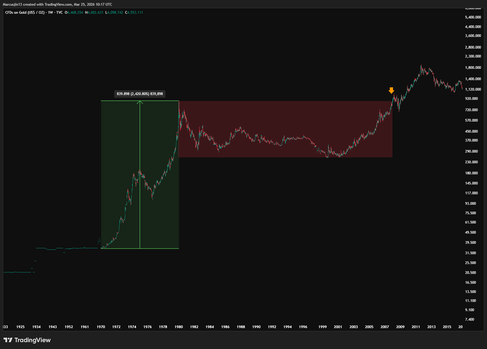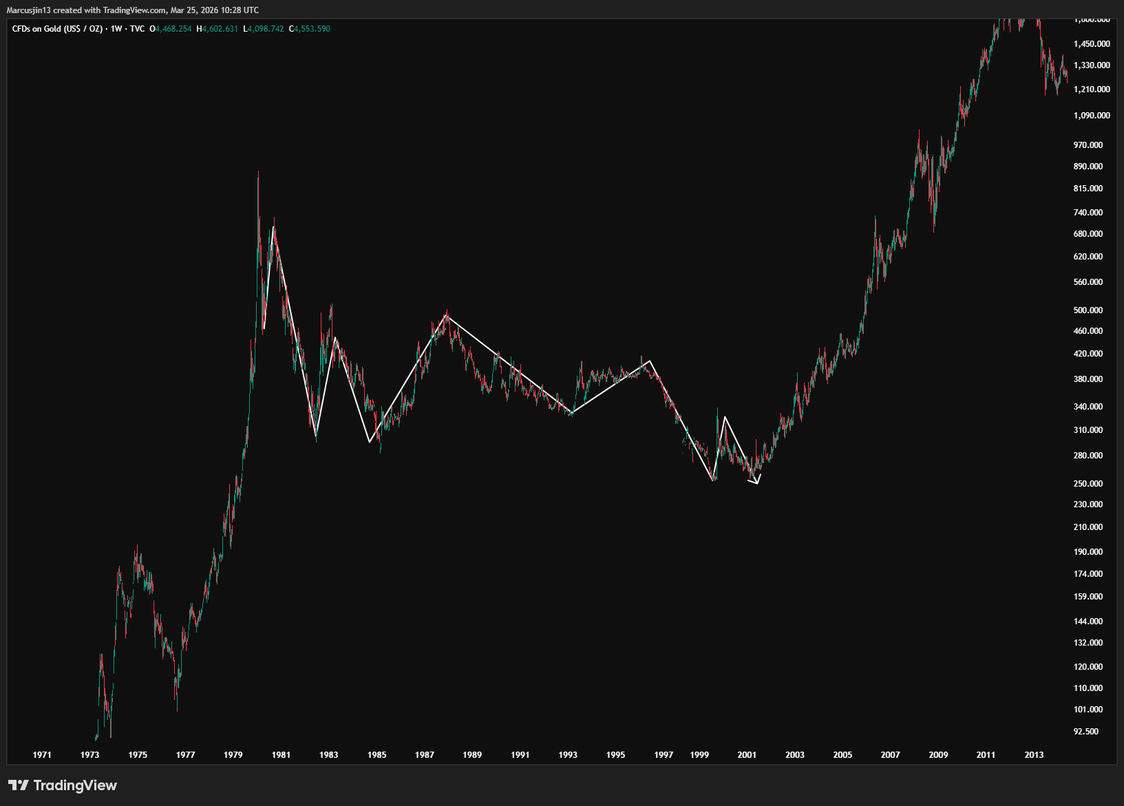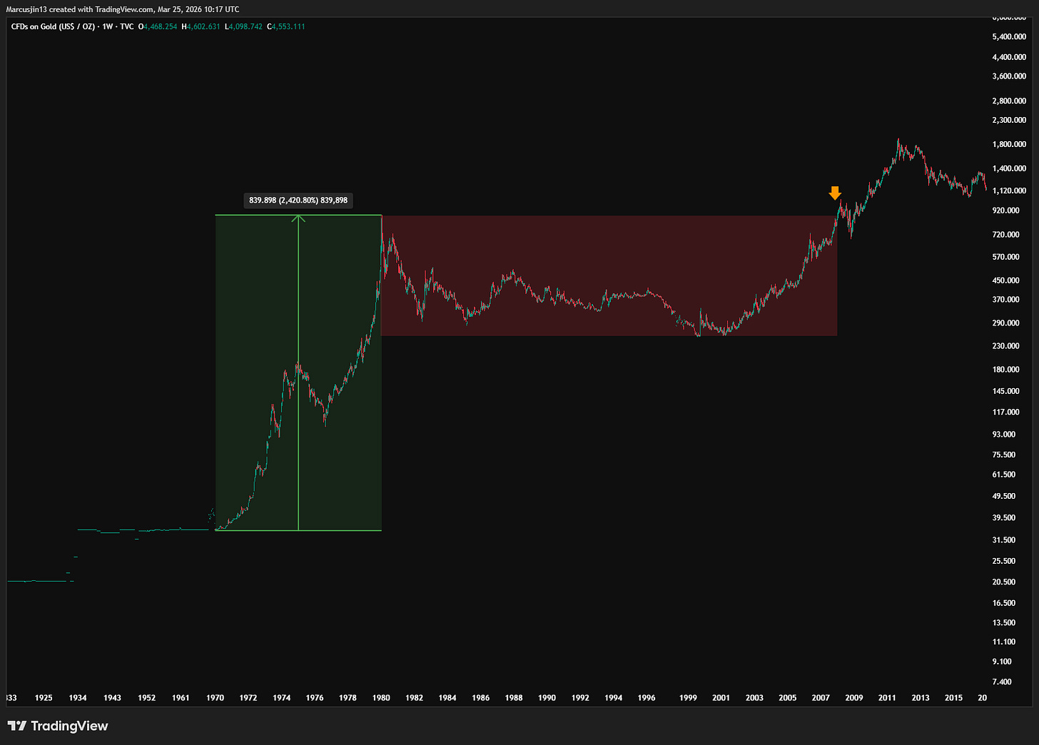 直到 2000 年,黃金從 1980 年高點累計下跌約 72%,才真正完成一個世代級的底部。